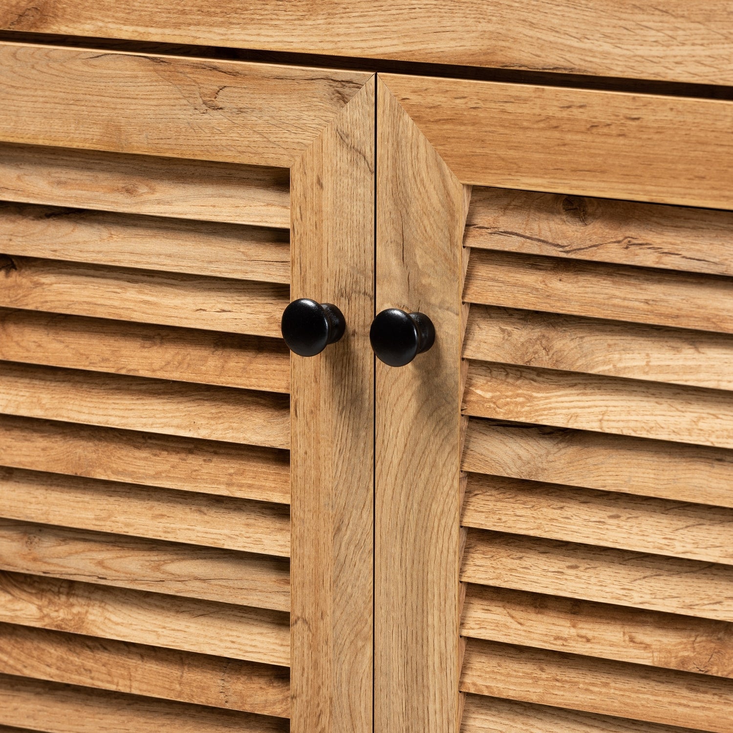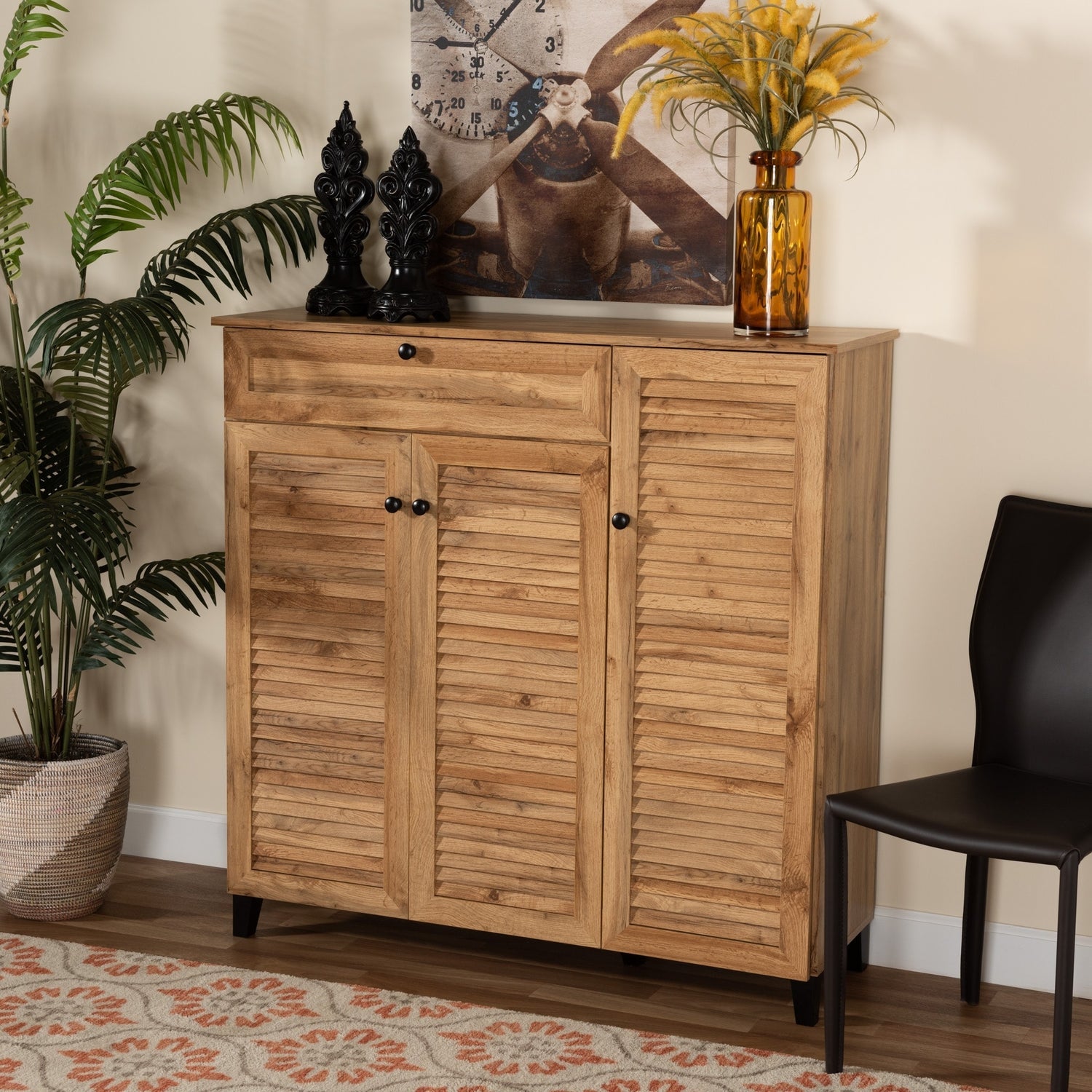 Store your shoes on the sly with the Coolidge shoe cabinet. Made in Malaysia, this cabinet is constructed from sturdy wood. Three slatted doors, fitted with round knobs, conceal 11 shelves with storage space for up to 21 pairs of shoes. One spacious drawer, accented with inset paneling, provides additional storage space for miscellaneous items. Requiring assembly, the Coolidge is set on top of tapered legs for a refined silhouette that provides elevation to deter dust buildup...