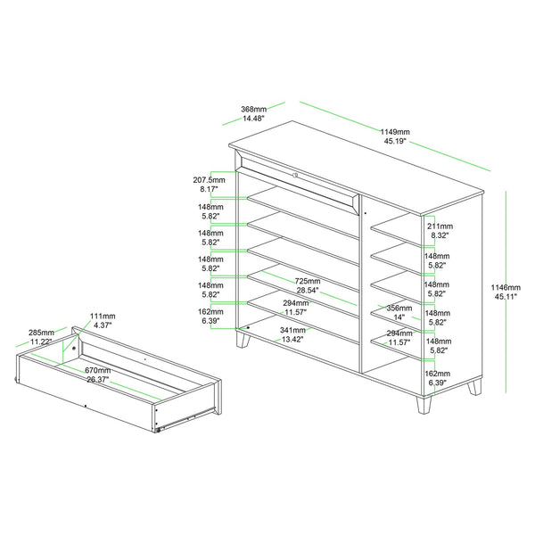 - Eleven (11) shelves provide space for about 21 pairs of shoes, depending on size