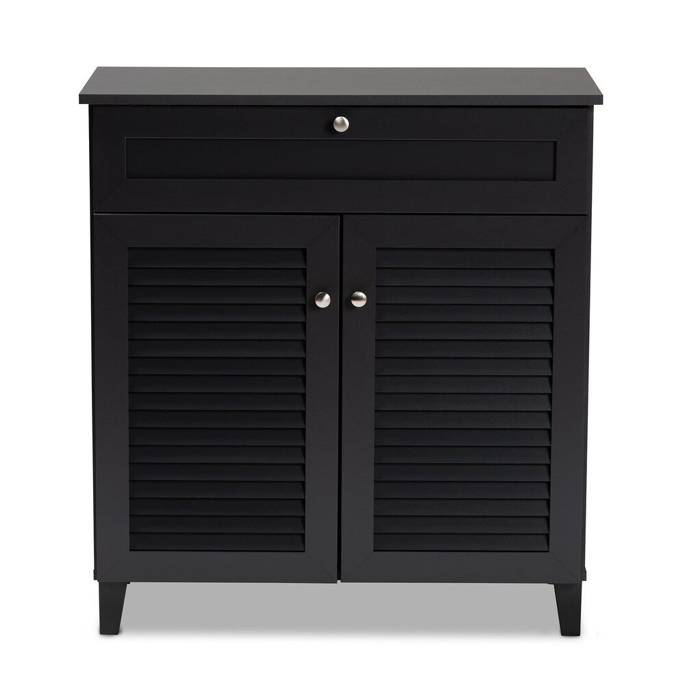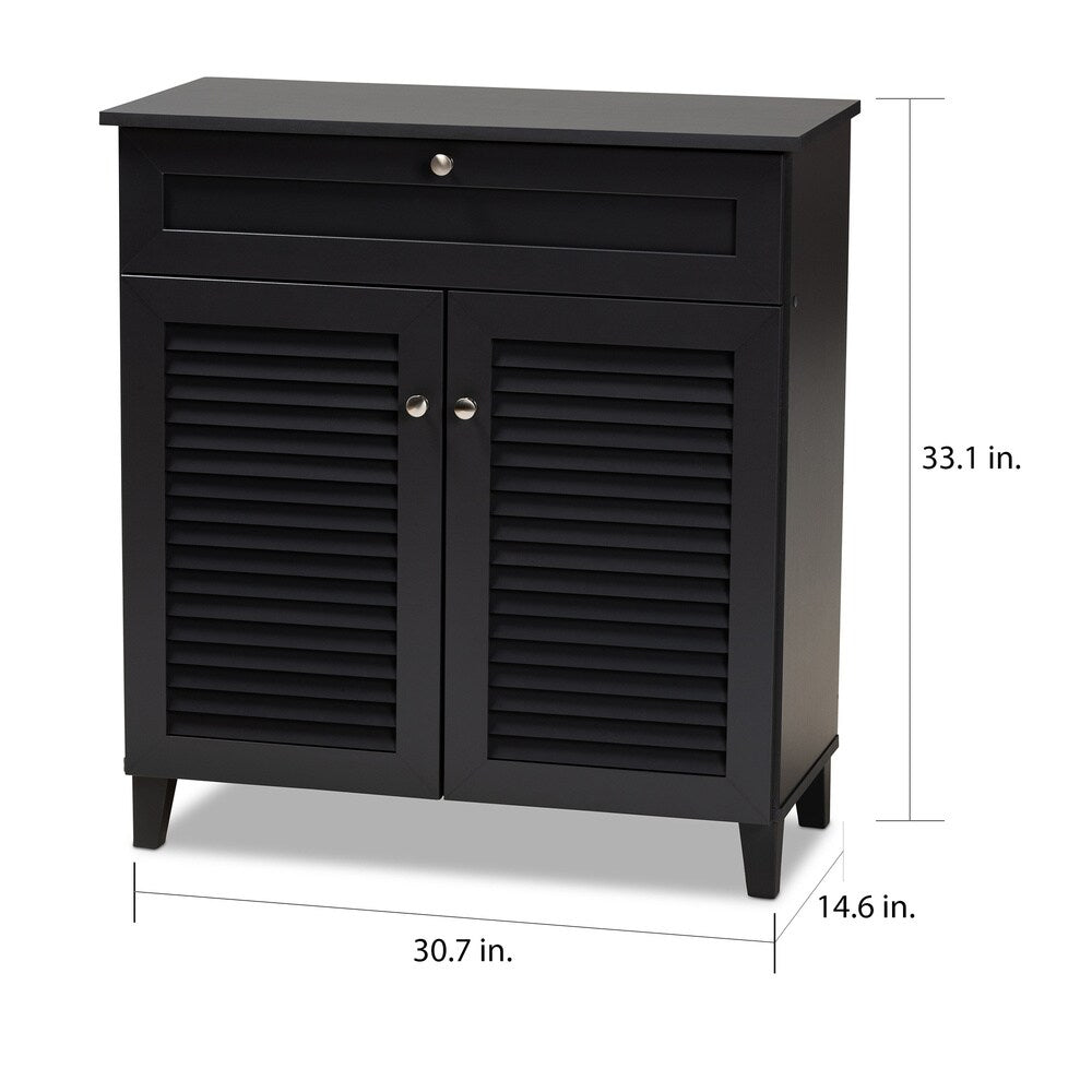 Arrange your collection or organize family footwear in this shoe storage cabinet. This cabinet's compact size makes it ideal for the bedroom or foyer, and its upper drawer provides storage for laces, repair kits, and other small necessities.