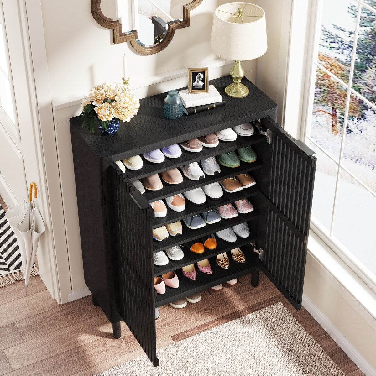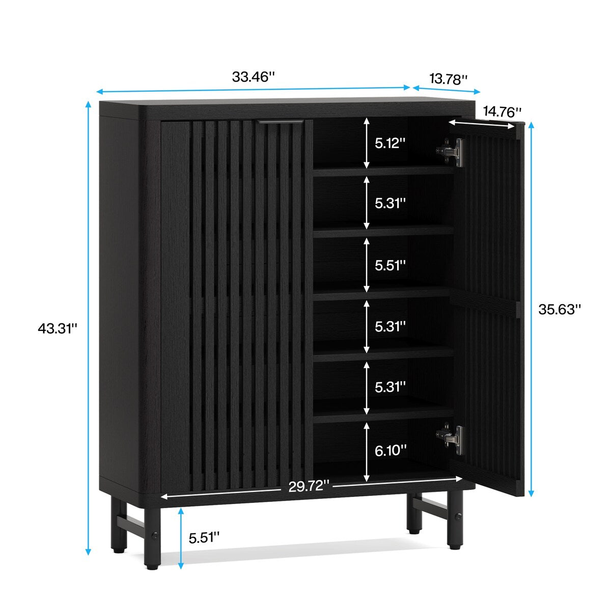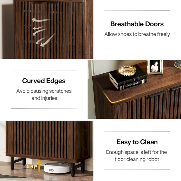 Our sleek shoe cabinet, characterized by its well-ventilated louver doors, provides an optimal, airy storage space for your shoes to enhance their longevity. Flaunting a stylish dark walnut finish, it measures 33.46''W x 13.78''D x 43.31''H and provides ample storage with 5 adjustable shelves for various shoe sizes. Crafted from high-grade MDF with sturdy metal legs, it comes with safety enhancements like rounded edges and an anti-tip device. With an easy assembly process facilitated by a detailed instruction guide and accompanying accessories.