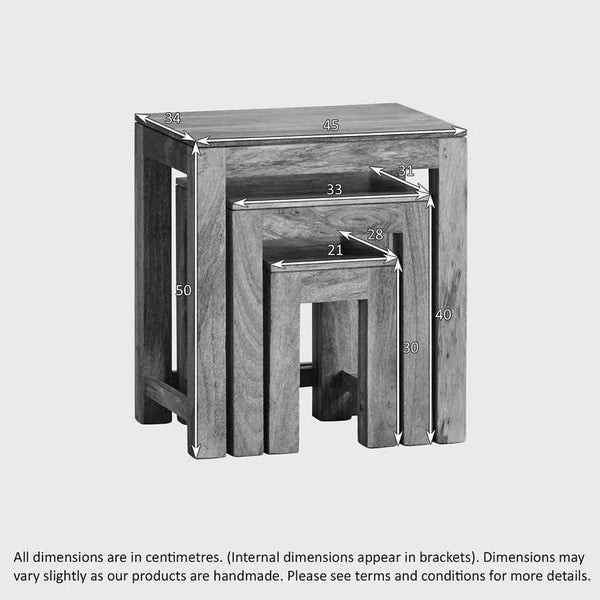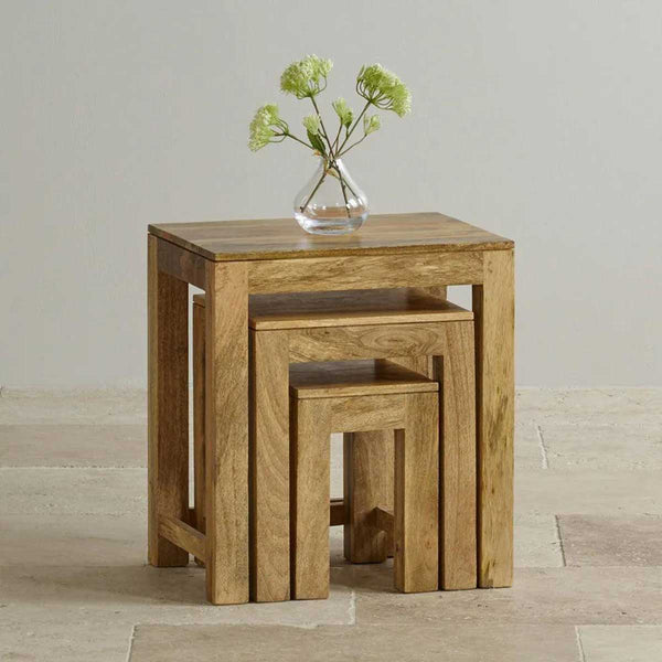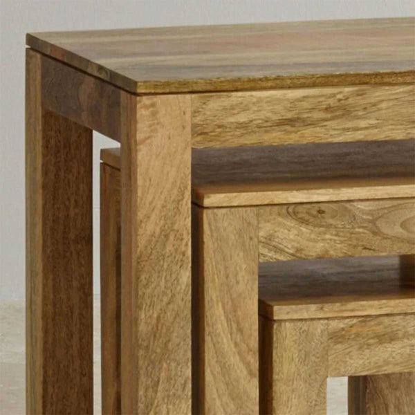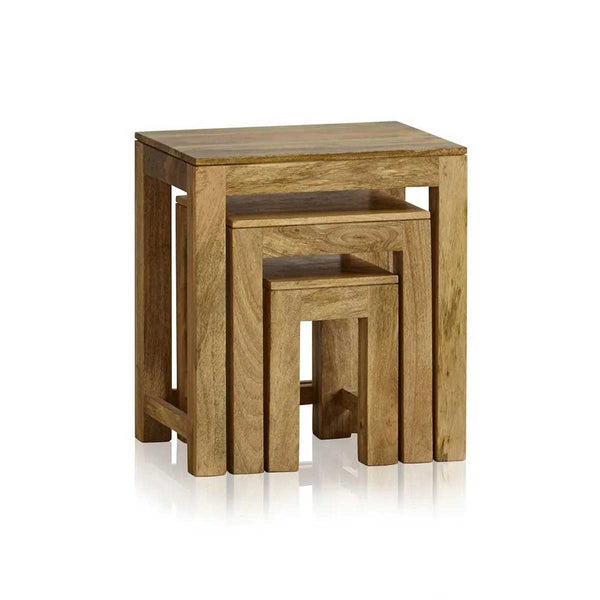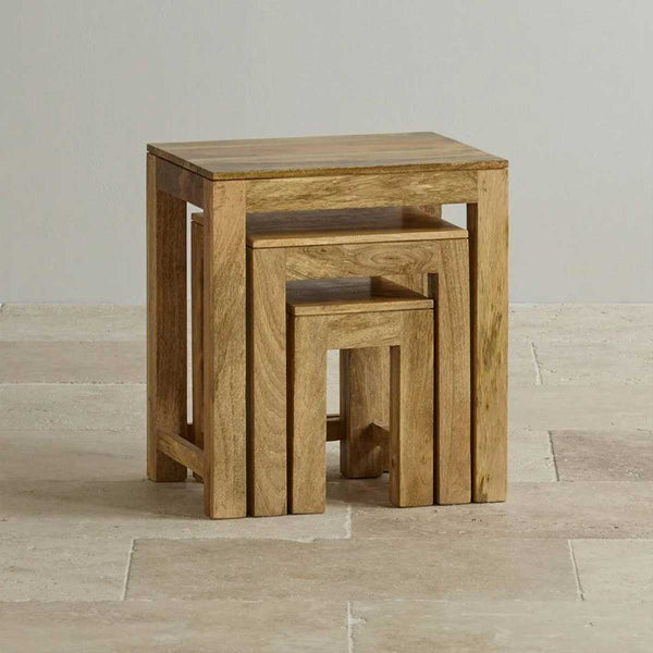 Bring home the stylish and functional Wooden Nesting Tables of premium solid 100% Mango Wood. This set of three unique tables features a natural finish with warm shades, adding a touch of elegance to any room.
