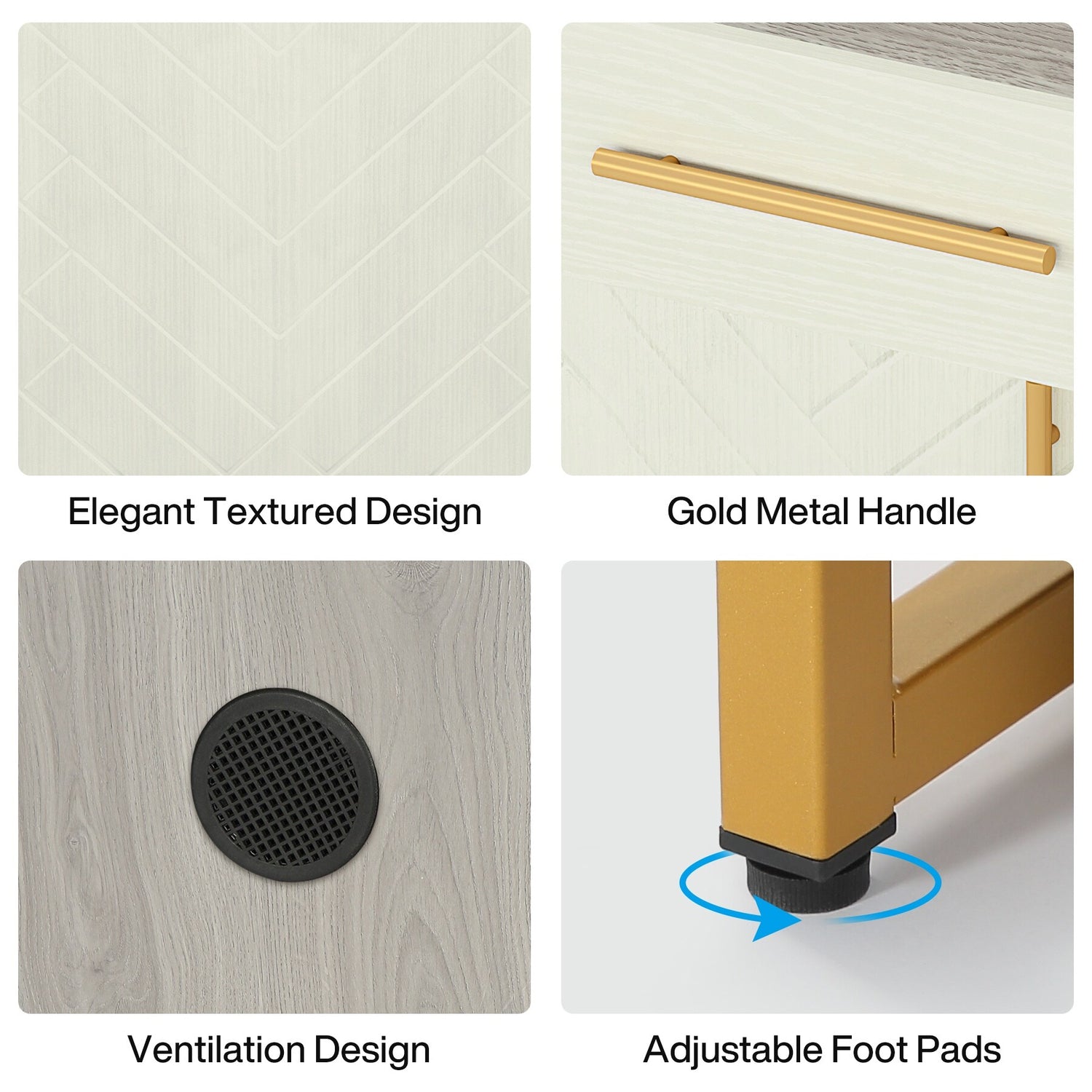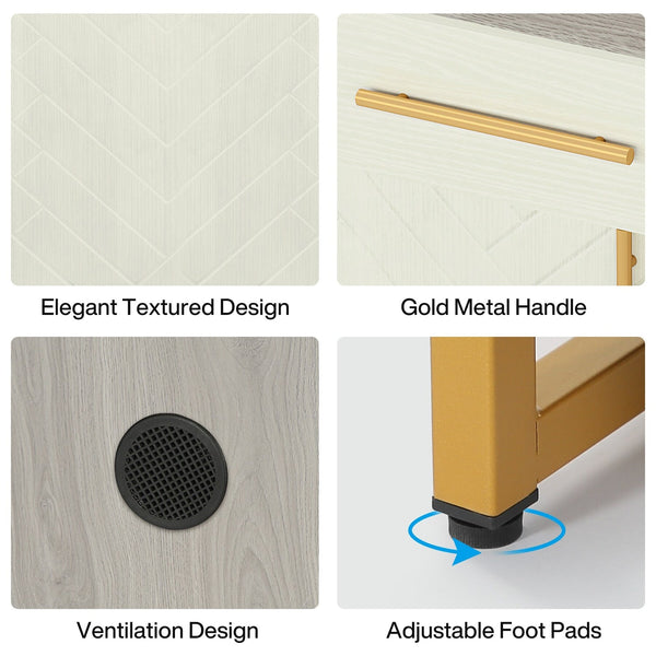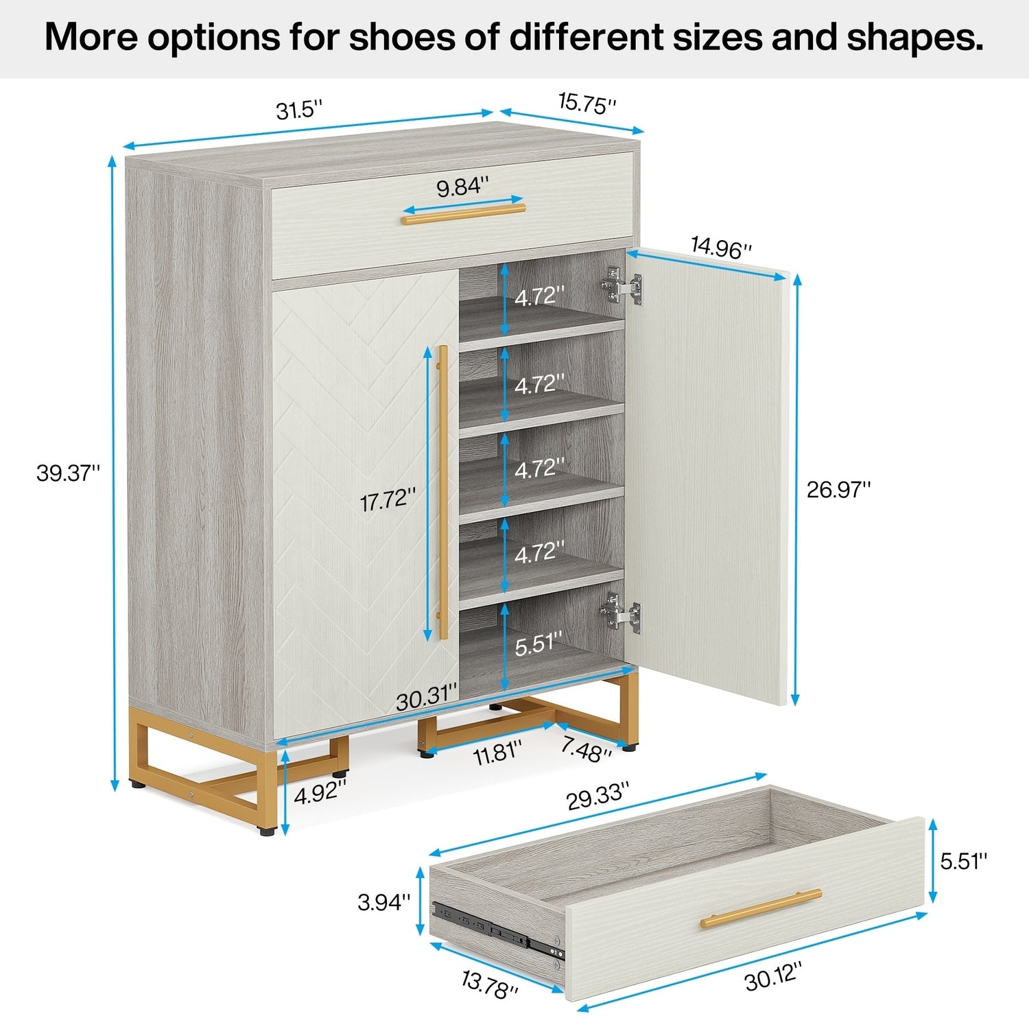 Upgrade your home organization with our stylish shoe cabinet, featuring a unique textured herringbone design and chic gold detailing. Perfect for any entryway or living area, this cabinet provides 5 adjustable shelves and a drawer to stores your shoes while adding a touch of modern elegance to your decor.Features: